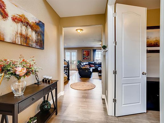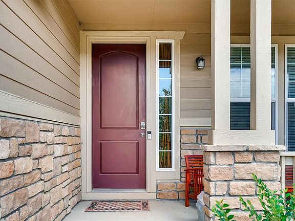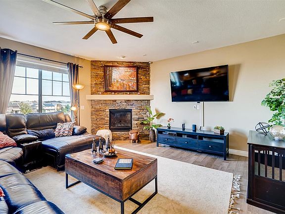 Beautiful 4 bed, 4 bath home features south facing driveway and charming front porch. When you walk in the home you are greeted with new beautiful hardwood floors, 8' doors and open concept floor plan. Bright office features french doors. Large great room showcases stacked stone gas fireplace, pre-wired for surround sound, expansive views of open space. Large kitchen has huge island, 42' cabinets, stainless steel appliances, farm style sink and large area for dining table with french doors to oversized deck. Upstairs bright, large master bedroom has 5 piece master bathroom and large walk-in closet. 2nd bedroom has its own ensuite bathroom, and bedrooms 3 & 4 share a jack-n-jill bathroom. Large walkout basement is ready to be finished or used for storage. Home backs to open space and community trails; backyard paver patio under deck, turf putting green and horseshoe pit, great for entertaining!