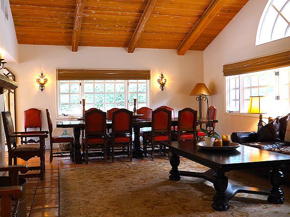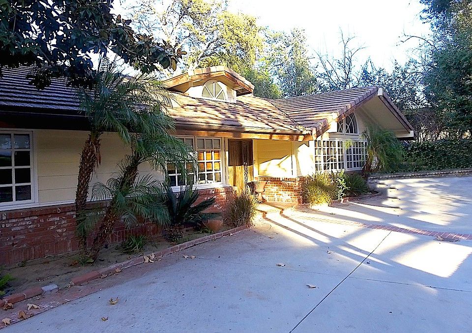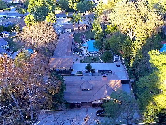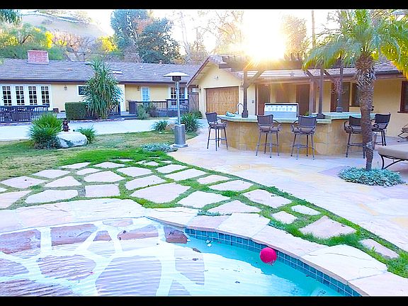 Hidden Hills Equestrian Hacienda on a flat park like acre complete with pool, spa water slide, babbling stream water feature and a built in BBQ with bar. This 4 bedroom and 3 bath house has a large living room with vaulted wood ceilings and great outdoor dining areas. The master has a walk in closet and opens up to a sitting area on the back deck. The large guest house adds an additional 1,400 sq ft and is separated into 4 rooms which are currently used as a gym, office and two bedrooms with bathrooms. Three stall barn with tack room open to a good sized sand arena. The street to street flat acre creates a great opportunity for a developer as well in this very coveted neighborhood.