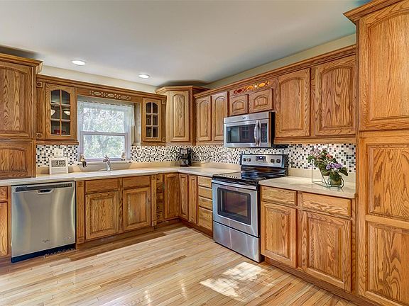 Welcome home to this custom ranch home on .82 acres w/ 4 beds and 3 full baths waiting for you. This home has so much to offer from the hardwood floors thru-out the entryway, hallway, great room, kitchen and breakfast room to the majority of the home having been freshly painted. Other features include gas fireplace in the great room, custom oak cabinets in the kitchen w/ crown molding, Corian countertops, stainless appliances, center island that can be moved to the side of the refrigerator or to the center of the kitchen...your choice. Divided bedroom floor w/ large oversized bedrooms, main floor laundry, finished w/out lower level w/ wet bar and bar stools included. Lower level offers large 4th bedroom, full bath, family room/rec room and tons of storage as well. Spacious deck off the great room and oversized concrete patio just outside the LL family room overlooks the amazing wooded lot and landscaping. Only thing missing is You!