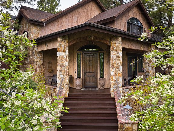 A reflection of Tuscan & Northwest design, this iconic Shevlin Ridge Neighborhood home is admired for its architectural integrity and beauty. The timeless stucco exterior is further defined by the abundant use of natural Montana Gold stone and brickwork, arches and a grand gabled roof line. A stamped concrete walkway leading up to a large entry and porch deck made of Ipe Brazilian Walnut. Superior interior finishes include knotty Alder cabinetry, slab granite counter tops, beautiful hickory wood floors, gourmet kitchen with center island, built-in wine & serving bar with brick & stone surround and a stunning limestone fireplace in the gathering room. Plus the 4th bedroom/studio has its own sitting area & bath. The exterior flagstone patio courtyard is highlighted by a stone wood burning fireplace with gas starter plus a stone staircase to a private, arbor enclosure with sitting area. Enjoy music outside with your guests from the exterior speakers. The perfect place to relax & unwind.