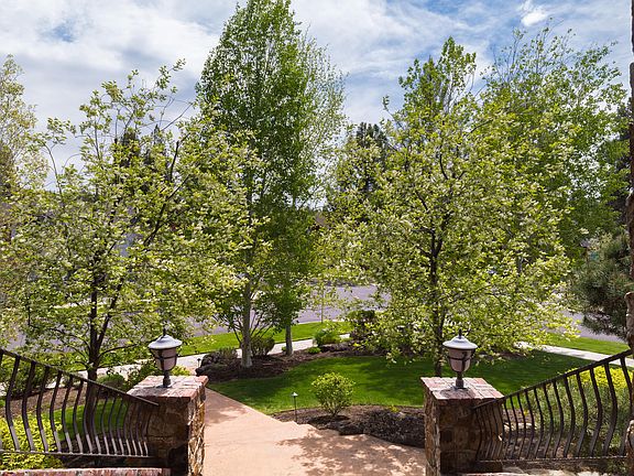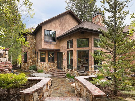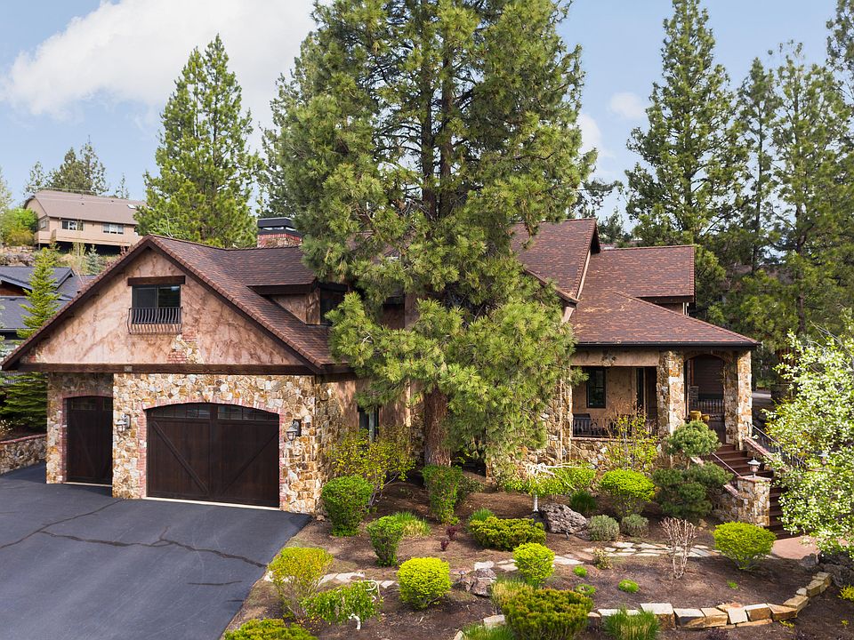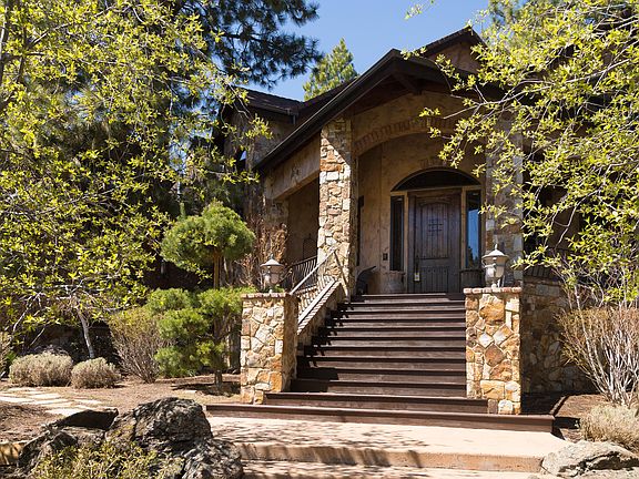 A reflection of Tuscan & Northwest design, this iconic Shevlin Ridge Neighborhood home is admired for its architectural integrity and beauty. The timeless stucco exterior is further defined by the abundant use of natural Montana Gold stone and brickwork, arches and a grand gabled roof line. A stamped concrete walkway leading up to a large entry and porch deck made of Ipe Brazilian Walnut. Superior interior finishes include knotty Alder cabinetry, slab granite counter tops, beautiful hickory wood floors, gourmet kitchen with center island, built-in wine & serving bar with brick & stone surround and a stunning limestone fireplace in the gathering room. Plus the 4th bedroom/studio has its own sitting area & bath. The exterior flagstone patio courtyard is highlighted by a stone wood burning fireplace with gas starter plus a stone staircase to a private, arbor enclosure with sitting area. Enjoy music outside with your guests from the exterior speakers. The perfect place to relax & unwind.
