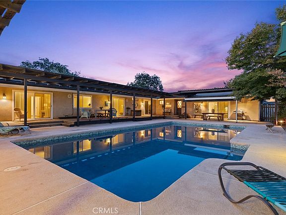 Welcome to your private oasis nestled on over 5.5 acres of serene countryside in Durham, CA. This property offers the perfect blend of luxury and comfort while embodying the essence of country living. Surrounded by orchards, it provides a serene and picturesque setting. As you enter the property via a private road, you'll be greeted by a custom-carved entry arbor leading to an enchanting courtyard adorned with olive trees, setting a warm and inviting tone. The expansive 2,965 sqft home boasts 4 bedrooms and 3 bathrooms along with separate living and family rooms. Inside this custom-built mid-century home, you'll find ample space for hosting gatherings both large and small. The charming kitchen offers dual ovens and a spacious walk-in pantry, perfect for all your culinary needs. There’s a cozy eating area for casual meals. For more formal gatherings, there's a separate dining area. The backyard is an entertainer’s delight, featuring a large pool with a newly refinished surface and a brand-new pool pump. The expansive area includes a romantic grape arbor, plus a custom-made trestle table and benches, a pergola, deck, and stage, all crafted from milled redwood sourced from the historic Patrick Ranch. This area is perfect for alfresco dining, celebrations, or simply enjoying the peaceful surroundings. The landscape is a gardener's dream with two rows of walnut trees (English and Arizona varieties), and a delightful assortment of fruit trees, including pear, fig, persimmons, apricot, plum, almond, peach, and pomegranate. There is also ample room for a garden, allowing you to cultivate your own fresh produce. Practical amenities include a new agricultural well pump, a domestic well, a water softener, new septic leach lines, owned solar panels, and dual paned windows throughout, ensuring efficient and sustainable living. Conveniently situated between downtown Durham and Chico, this property offers the best of both worlds – a private, tranquil setting with easy access to the amenities and attractions of nearby towns. This exceptional property is a rare find, offering a unique opportunity to experience the best of country living. Schedule your private showing today.