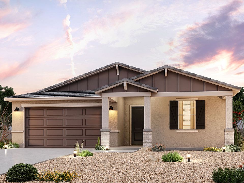 Ranch ; 2 Bay Garage with Entry ; Mud room ; Foyer ; Kitchen with Island, Pantry and Dining Room ; Great Room with Yard Access ; Primary Suite with Bathroom and Large Walk-In Closet ; Bedroom 2 with En-Suite Bath ; Bedrooms Three and Four Share Full Bath ; Laundry Room ; Covered PatioOptions: Primary Bath Tub and Shower ; Primary Bath Shower ; 8 ft doorsImpressive Included Features: 9' ceilings throughout, covered patio, front yard landscaping, ceramic tile flooring at entry, kitchen, all baths and laundry, granite slab counters in kitchen and baths, stainless steel kitchen appliances, Century Home Connect smart home technology.
