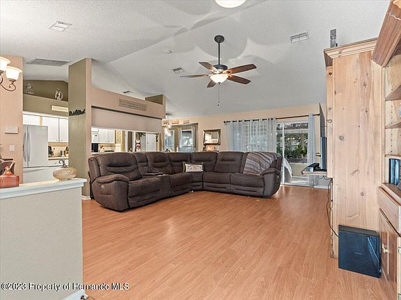 Active with contract: 3/2/2 built by Beck custom builders in quiet Spring Hill neighborhood. Extra long driveway to accommodate company and several cars. Double door entry into spacious great room with vaulted ceiling & laminate flooring, dining room, kitchen with nook and lots of cabinets. Inside laundry room with open pantry. Split plan design with pocket door access to 2 bedrooms and full bath updated vanity in 2nd bathroom. Master bedroom with en suite. Shabby Chic vanity in master. Oversized tiled shower stall, Double closets both walk in for his and hers. Enclosed lanai is 150 sq ft and under truss could be used as a flex room. Interior utility room, washer and dryer included. Beautiful fenced back yard with additional brick paver open patio, perfect for outdoor dining, having a fire pit, great for barbecues and still plenty of room in the yard for a garden or just playing around. Neighborhood is close to Springstead High school which offers an IB program. Sellers are offering $5000 toward buyers closing cost with acceptable offer.