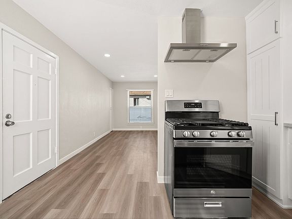 Modern gas stoveContemporary vanityFresh two-tone paintBrand new quartz countertopsRemodeled bathroomSleek new kitchen cabinetsDurable vinyl click flooring