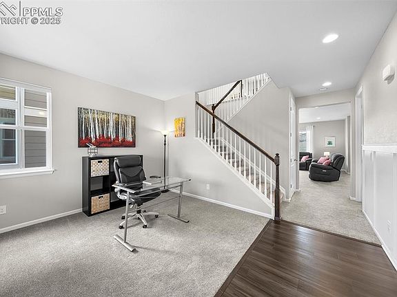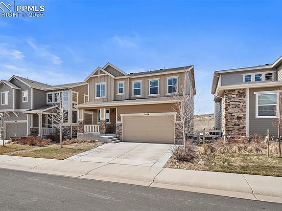 Ultimate move-in ready pre-inspected home with expansive wide-open layout, enormous dream kitchen, endless upgrades, backing directly to greenbelt and Rhyolite Park! Perfect front porch welcomes you to this bright & open home with luxury vinyl and new carpet throughout. Front study opens to the heart of the home that is filled with light! Flawless family room pre-wired for surround-sound connects directly to incredible kitchen with spacious breakfast bar island, abundant countertops and cabinetry, double-oven, French-door fridge, custom pendants, and large pantry with outlets for all your appliances, next to super-convenient mudroom enroute to the oversized garage. Extended dining room, soaked with sun, to partake of unobstructed view that leads to deck. Upstairs you’ll find endless opportunities for the large loft with views, an upgraded full bathroom with granite vanity, and two picture perfect bedrooms, each with walk-in closets. The primary suite is spacious with even more views, custom barn door to 5-piece bath & huge closet. The large 1200+ basement is roughed-in for a 4th bathroom, insulated and ready for your boundless possibilities! Colorado-perfect backyard for those summer sunsets with new composite deck & electronic awning for maximum comfort! Nothing overlooked-–concrete sidewalk on north side added along with expanded driveway sides. Low maintenance with vinyl fencing, concrete siding, composite deck, & high-efficiency HVAC. For low HOAs you get it all! Vibrant family-friendly community, Rhyolite park with every amenity literally in your backyard just steps away: huge playground, multiple pavilions, synthetic turf field, pickleball, basketball, disc golf course, mountain bike park & trails – don’t forget the included recreation center with swimming pool, fitness center, trail system! The new I-25 exit under construction will make Crystal Valley access super-convenient & boost values for decades! Phenomenal value!