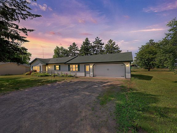 Located just 15 min N of St. Croix Falls - this lovely single level home has 3 bedrooms & 1 bath. A 2 car garage that is attached to the home & 1 stall is attached to the heated den out back. Huge backyard with a nice patio. All on one level, easy living, easy care! Move in and savor the rural feel. Enjoy life with a small store & eateries close by. You will love the large, spacious kitchen, the newly upgraded bath with large shower, the extra large living room with a propane fireplace, dining room has a wood burning stone fireplace. All brand new appliances: hot water heater, furnace, central air, fridge, range, washer and dryer, all less than a year old. Roof, gutters, & vents new too.