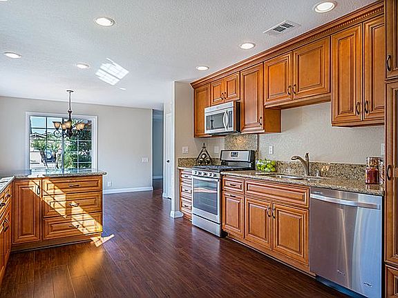 Stunning renovation just completed! This beautiful home is in the highly sought after neighborhood of Cordova Vista with Lake Mission Viejo privileges. Fantastic floor plan with 1 bedroom & 1 full bath down, 4 bedrooms & 2 full baths up. A chef's dream kitchen w/an abundance of mocha-stained cabinets with soft close drawers & doors, built-in glass display cabinets, granite counter tops, new Whirlpool stainless appliances, dining room & kitchen counter sitting area. Large living room w/fireplace, large family room w/fireplace, distressed hardwood laminate flooring entire downstairs, new carpet ceramic tile upstairs, oil rubbed bronze hardware, new windows and doors, including new beveled-glass front door, master bath upgraded, large walk-in master closet, mirrored closet doors, finished garage. Many mature palm trees, stamped & colored concrete in backyard w/2 covered patio areas. This is a gorgeous LIKE NEW home, a BUYER'S DREAM at a JUST REDUCED PRICE!