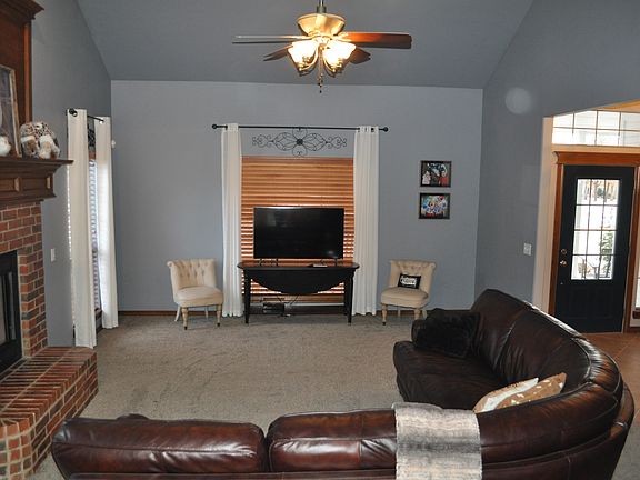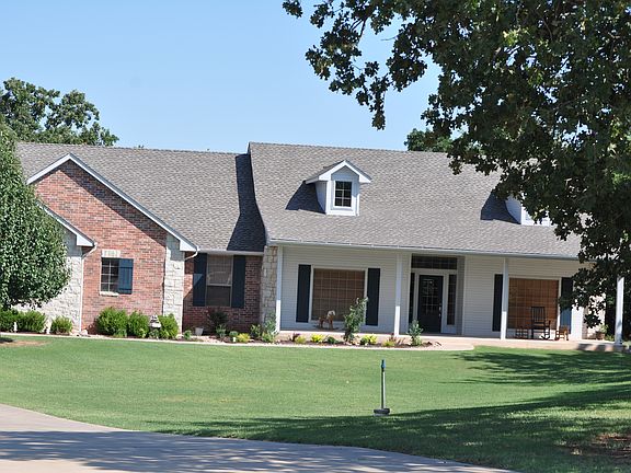 Beautiful treed 1.14 acre lot. House sits on quiet culdesac and giant oaks provide privacy. Massive front porch is a wonderful place to sit and rest or entertain. Covered patio ideal for cook outs or to bird watch. Interior has been recently updated. New paint, thick carpet, wood doors, stacked stone in office/dining room. Living room is large with cathedral ceiling, fireplace and faux wood beam that is a beautiful addition to such a high ceiling. New ceramic cooktop, granite, GE Cafe counter depth refrigerator, microwave, sink and back splash in kitchen. Large walk in pantry with several shelves. Master bedroom has a tray ceiling and is a large suite with bathroom that has been updated with massive two separate shower heads, granite and sinks and whirlpool tub. Massive master closet measures 14x8 feet m/l. Wooden shelves and hanging rods galore. Linen cabinets and closets for storage through out entire house. Other bathrooms have new granite and vessel sinks and faucets. Second and third bedroom have large closets. Large three car garage and long driveway means lots of parking. Roof is just two years new and outside of house was painted in 2017. New landscaping and TruChem has been treating yard to maintain a pretty yard. Water is from private well and water softener located in mechanic closet in garage. Located in Oakmont Addition. A storm shelter is located above ground in garage. It was installed in 2015.