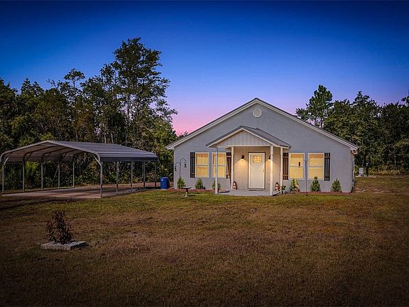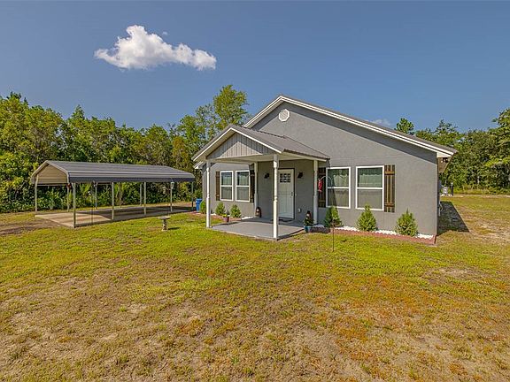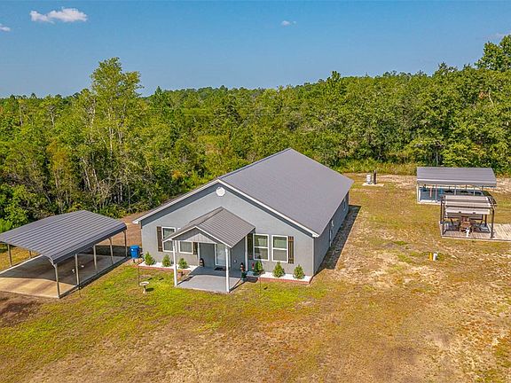 Custom built home completed in 2023. Low maintenance stucco exterior with metal roof and adorable front porch. Open floor plan with vaulted ceilings. Kitchen with granite countertops and stainless steel appliance package. Plenty of room for a large dining table and living room set. ADA width hallways and door frames in the home (most doors). HUGE primary bedroom with tongue & groove ceiling. Ensuite bath with double vanities, soaking tub and a beautiful tiled shower with bench and builtins. Outside you will find two carports with concrete slabs, a covered patio, and rear grilling porch. Property also features full RV hookup, Private Well, No HOA and located in an X flood zone.