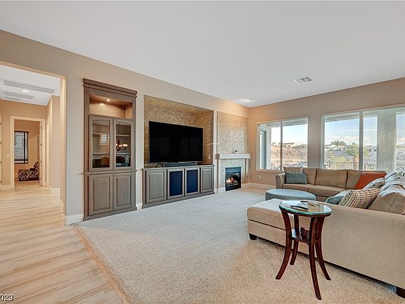 Immaculate pool home located on an elevated lot above the Concord Golf Course with mountain views. Located in the 55+ Sun City Anthem Community. Gated courtyard entry. Inside features a gorgeous open great room with large picture windows that give way to spectacular views. Great room features built-in cabinets and a gas fireplace. Kitchen features an abundance of cabinetry, a large island, breakfast bar, double wall oven, and spacious nook area. Laundry room features a sink and lots of cabinet space. Guest room has space for 2 queen beds, full size bath with shower/tub combo. Owners bathroom with separate shower and jet tub. Large walk in closet. Spacious owners suite with access to your personal backyard oasis where you can enjoy spectacular sunrises and sunsets. You will love the heated pool/spa with fire features and waterfalls. A Built in BBQ and outdoor fireplace. New HVAC unit replaced in 2021. 1 year home warranty provided. This home truly shows pride in ownership. A rare find.