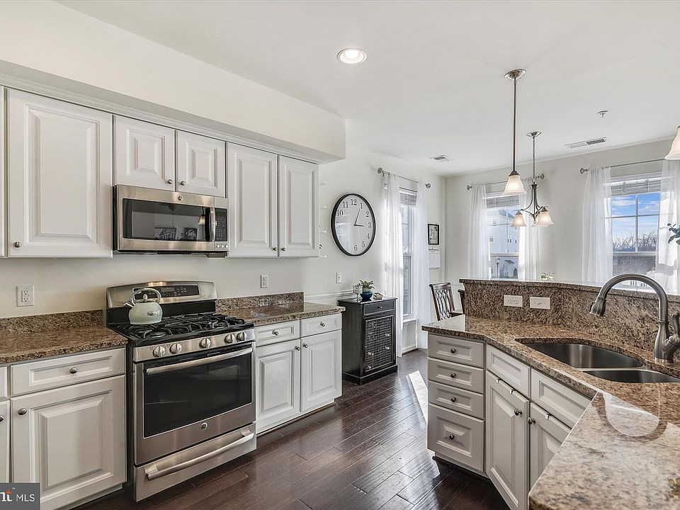 This spectacular end unit, townhouse style condo has everything. The kitchen features granite countertops with under-mount sink, stainless steel appliances, recessed lights, buit-in microwave, pantry, gas range and pendant lights. The living room is a welcoming gathering space with wide-plank hardwood floors, lighted ceiling fan and great natural light from the double French doors with side lights and transom windows. Enjoy your morning coffee or evening wine on the balcony just off the living room. The dining room is open and bright with windows on two sides and a fashionable chandelier. The primary bedroom suite has a dedicated floor of the property. The generously sized primary bedroom boasts four windows, tray ceiling, lighted ceiling fan and large walk-in closet. The primary bathroom features comfort height dual-sink vanity, elegant soaking tub, separate shower and dedicated water closet. The full size washer/dryer are conveniently located just off the primary suite. On another level you will find the two secondary bedrooms, both with lighted ceiling fans and ample closet space. The two bedrooms share a hall bath with full-size tub. The parking is a breeze with a large one-car garage and concrete driveway with room for a second car. New Central AC in 2021 + New Central Heat in 2022!! Please note there is condo fee of $225/month plus an HOA fee of $100/month which includes all the fantasitic amenities of Stone Ridge. Welcome home!