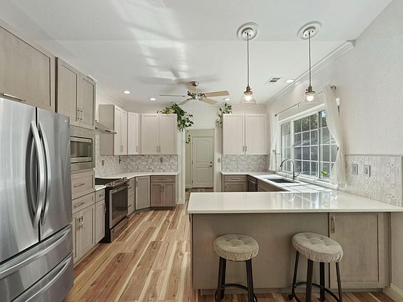 Welcome home to this updated 3-4 bedroom property on 1.30 acres, featuring modern upgrades and excellent storage. The custom KraftMaid kitchen offers full pull-out drawers, quartz countertops, a farmhouse sink, under-cabinet lighting, and a new electric glass top range. Major system improvements include a new HVAC system (2022), water heater (2025), and laminate wood flooring (2024). Exterior highlights include a metal RV/boat carport, WiFi-controlled drip irrigation, leaf gutter guards, and an oversized septic system. The flexible layout includes space for an office or 4th bedroom. Move-in ready with quality updates throughoutplus, enjoy stunning sunsets from the back porch! Call today!