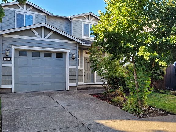 This beautiful single-family home is located in Eugene's Gilham neighborhood, offering a low-maintenance and convenient lifestyle. It features three bedrooms and two-and-a-half baths, with 9' ceilings, a slate entry, stainless steel appliances, granite, hardwood, and carpet floors. The central gas heating and air conditioning provide comfort throughout the home. The living room boasts a cozy fireplace, and the upgraded open kitchen has a dining area on the main level. Upstairs, you'll find three bedrooms and two bathrooms, including a master suite with an attached bathroom and walk-in closet. The attached garage adds convenience, and the low-maintenance exterior is taken care of by the HOA, which also handles front landscaping. You'll be close to shopping, schools, parks, and Riverbend. A pet would be considered with an additional deposit.