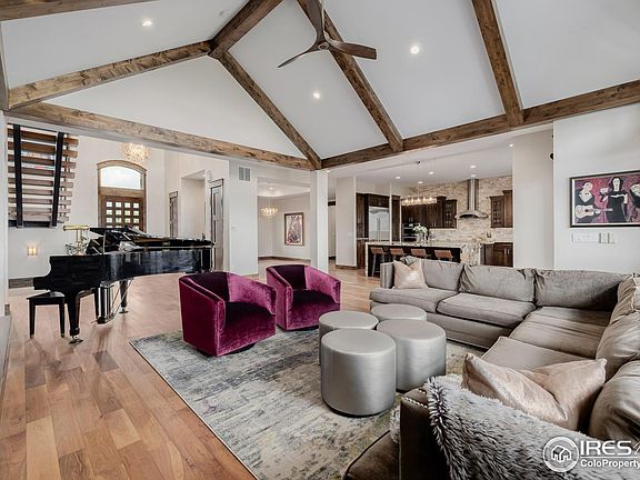 THE FRONT RANGE ESTATE - Welcome to your luxurious retreat in the coveted Spruce Meadows neighborhood. This contemporary mountain-style home showcases unparalleled craftsmanship and attention to detail. Vaulted ceilings create a grand, spacious atmosphere, while walnut floors throughout the home, including the primary bedroom, add warmth. The gourmet kitchen is a chef's dream with Jenn-Air appliances, granite countertops, main and prep sinks, 2 dishwashers, 2 oversized islands, microwave/speed cooker, warming drawer, wine fridge, ice machine, and induction stove. The main-floor primary suite includes a cozy seating area, fireplace, a lavish bath with radiant floors, steam shower, freestanding tub, and dual sinks, and a grand walk-in closet with built-in dresser island and floor-to-ceiling shoe racks. The 4-car garage features 2 EV charging stations and ample storage. The polished concrete walk-out basement offers a full kitchen, home gym, bedroom, and bath. Upstairs, 3 en-suite bedrooms with walk-in closets and a loft with built-in desk and shelves provide space for relaxation. A dedicated office includes built-in storage and a half-bath. The backyard is perfect for entertaining with a lighted full-court basketball court with pickleball lines, a large TimberTech deck, sunken patio, and natural gas hookups for a grill and fire pit. The rounded driveway adds curb appeal. Experience luxury living at its finest-schedule your visit today. Property video link: