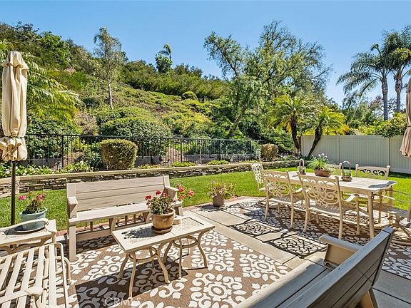Located on a peaceful Cul de Sac with an oversized lot, this meticulously maintained home exudes pride of ownership at every turn. As you approach the property, the front yard's curb appeal welcomes you with its well-manicured landscaping and inviting allure. Step inside to discover a stunning interior with high ceilings and a cozy gas fireplace in the spacious living room. The open layout creates a seamless flow between the indoor and outdoor living spaces, ideal for relaxation and entertainment. The first floor features solid surface flooring throughout, adorned with imported 20x20 porcelain tiles, upgraded 4" baseboards, and elegant crown molding in the kitchen and dining area. The kitchen is a chef's delight, with custom-designed pull-out shelves, professionally refinished cabinets, a center island, stainless steel appliances, under-cabinet lighting, a deep cast iron sink, and full slab granite countertops with a matching backsplash. Enjoy the serene green belt view from the master bedroom on the second floor, providing a peaceful retreat at the end of the day. This level offers two additional bedrooms, a guest bath, and an ensuite master bath, all upgraded in a neutral tone palette that complements the home's aesthetic. The master bath features a double sink vanity and a spacious walk-in closet, offering ample storage for your wardrobe. Outside, the beautiful OVERSIZED backyard beckons with lush green landscape and a private setting perfect for outdoor gatherings or quiet moments of relaxation. The vinyl fences and gates ensure privacy, while the wrought iron back fence allows for an unobstructed view of the maintained green belt slope. Additional features of this home include a complete PEX re-pipe, updated plumbing fixtures, an upgraded AC unit, and energy-saving solar panels. The property also benefits from ample storage space in the garage, which is equipped with built-in cabinets to keep things tidy and organized. Conveniently located near The Club at Rancho Niguel, which offers resort-style amenities, including a pool, spa, gym, and various sports facilities such as racquetball, pickleball, volleyball, basketball, and tennis courts. These amenities provide residents various recreational activities and fitness options, enhancing this beautiful home's luxurious lifestyle. Plus, its proximity to the freeways, renowned shopping, restaurants, and excellent schools make it an ideal choice for those seeking the perfect blend of luxury and convenience.