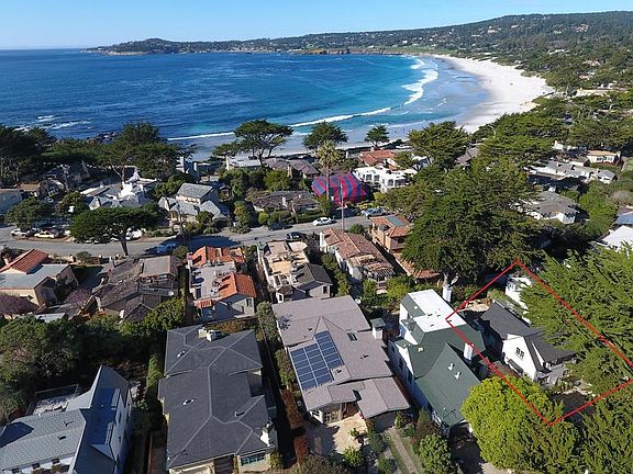 Price just reduced! At just one block to the beach, this perfect Carmel Point cottage awaits the buyer interested in experiencing fairy tale Carmel charm in the best of locations. Enjoy an efficient two-story layout with an upstairs master suite with Carmel Bay views, downstairs second bed with plenty of closet space, and living area with high, open beam ceilings, hardwood floors and wood burning fireplace. The kitchen features newer appliances, an adjacent dining area and sun-drenched solarium to brighten up the cottage interior. Enjoy incredible indoor-outdoor livability enhanced by a Carmel stone courtyard in front and large, fenced backyard with stone patio and separate, large deck accessed from the solarium. A single car, detached garage rounds out this quintessential Carmel cottage with charm, locality, and an ode to what makes this town and setting so special. Move in and enjoy the best of Carmel living or remodel to take advantage of the ocean views.