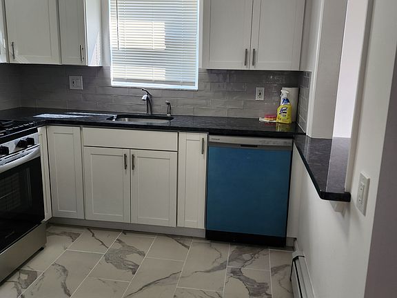 Modern white kitchen with quartz countertops, BRAND new SS appliances, and stylish grey tiled backsplash