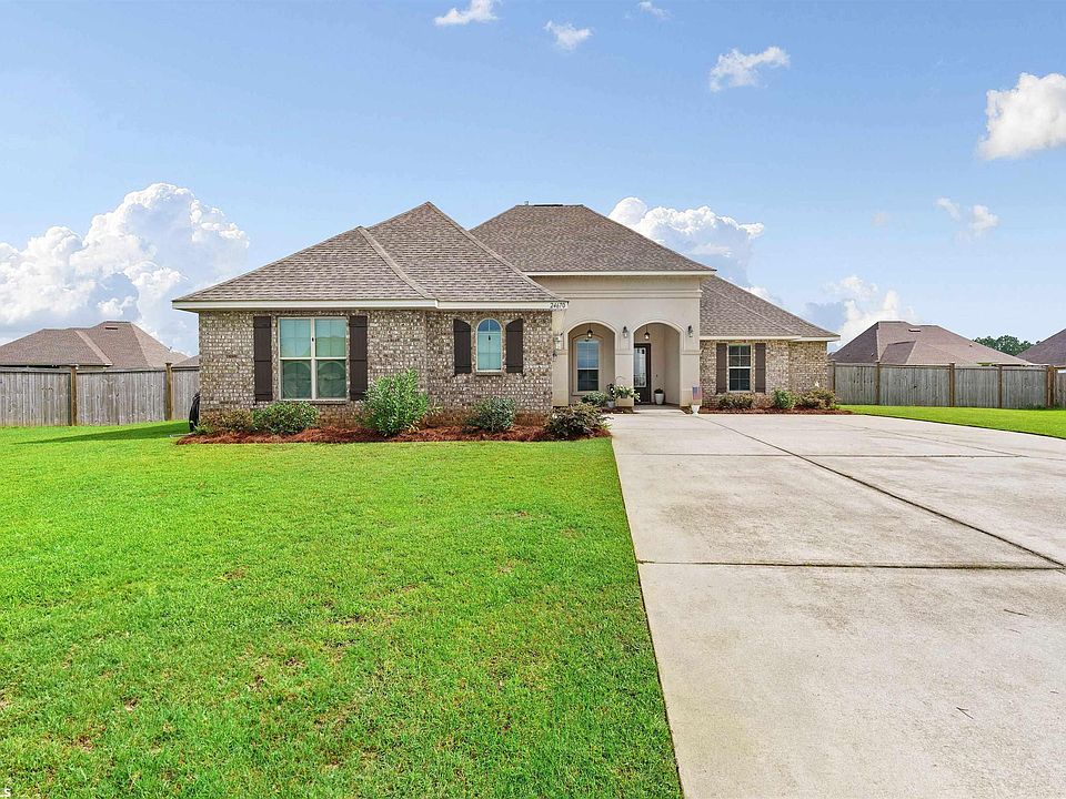 Introducing 24670 Caleb Court located in the sought after Canaan Place subdivision of Daphne. Situated at the end of a cul-de-sac on one of the neighborhood’s largest lots, this well-appointed, GOLD FORTIFIED home features over 2200 sf, three bedrooms, two and half bathrooms and a flex room that could be used as an office/study or fourth bedroom. The open and split floor plan includes a living room with centered gas fireplace, beautiful hardwood floors, crown moulding, and spacious kitchen with gas range, breakfast bar and gorgeous granite countertops. The oversized primary includes an en-suite bath featuring soaker tub and separate tiled shower. The primary closet has private access to the laundry room for your convenience! Other features are a mud room with drop zone and built-in desk. Enjoy time outdoors with the fully fenced backyard and covered back porch that offers gas and television hookups. Community amenities include clubhouse and pool! Qualifies for 100% USDA financing!