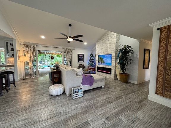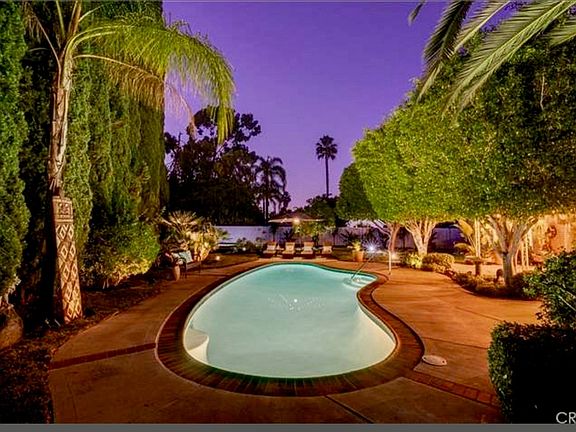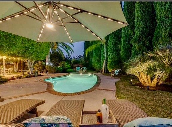 Sparkling blue swimming poolWater fountainBeautiful mature treesIncredible resort-like backyardNewly remodeled pool homeLush manicured landscapingHuge grassy park-like area