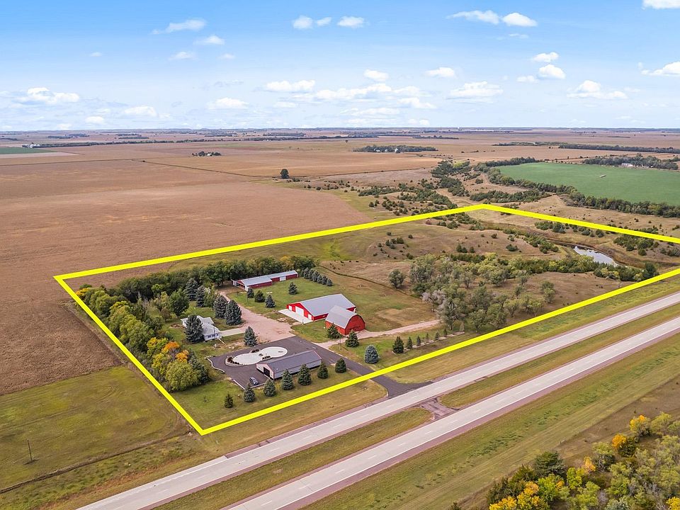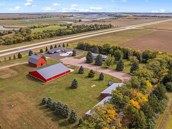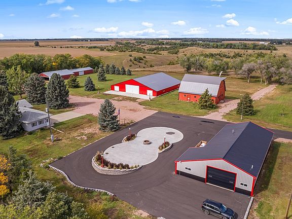 Only 1.5 miles north of the Mitchell Airport on Hwy 37 sits this picturesque 22-acre estate that includes a 2-bedroom/2-bath home with large attached garage and 4 huge accessory buildings. The north end of the acreage boasts your own private pond. Between the house and garages is a large paved/concrete area for get-togethers, collectible car displays, or just lounging on the breezy prairie