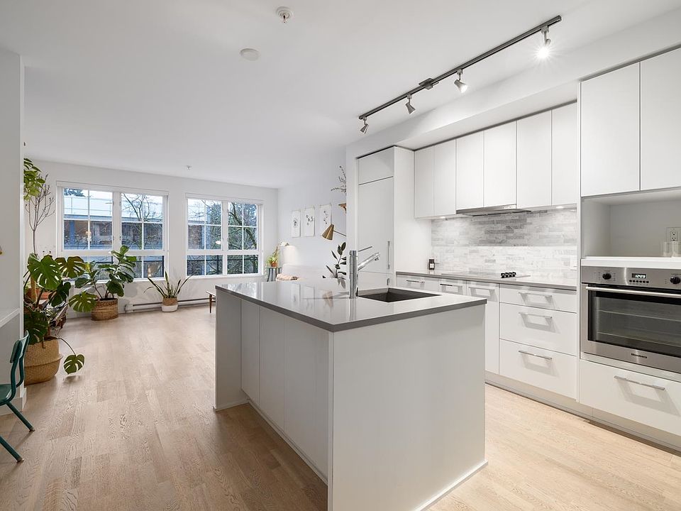 Priced under assessed value! Bayswater by Mosaic is a boutique building located in the prime location of Kitsilano. Soho inspired architect with modern interiors. This mint condition spacious open plan 1 bedroom home features oversized windows, a gourmet kitchen with a large island, composite stone countertops and marble backsplash. A perfect office nook right off the kitchen. Generous sized bedroom with a sizeable walk in closet. Brand new washer and dryer!! Shopping, dining, transportation just steps from your home in the coveted Kitsilano location! BONUS: Parking stall is EV ready! OPEN HOUSE SAT JAN 22, 11-1pm