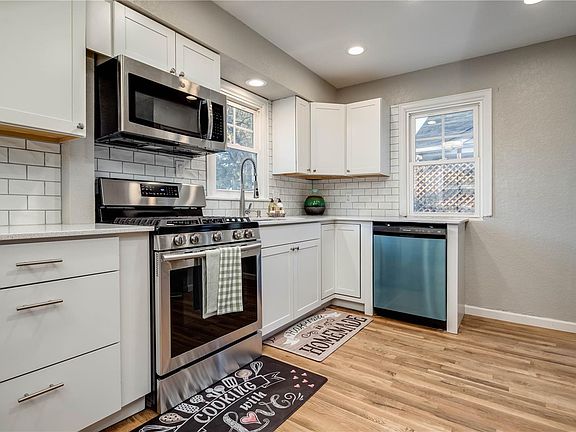 Located in QUIET neighborhood in Edgewater, This Beautiful Home is Completely REMODELED* Mother-IN-LAW SUITE: 2nd Kitchen & Laundry were added by current owner; SEPARATE Entrance, giving Owner a privacy *Kitchens feature NEW STL Appliances & PULL-OUT Faucets, QUARTZ Tops, Cabinets, Tile Backsplashes*Flat-Finished hardwood floor throughout on Main Fl. *Brand NEW A/C *NEW INT.& EXT. PAINT, NEW Concrete Front Steps*Upgraded ELECTRICAL, NEW Door Handles, Newer Windows *COVERED Back PATIO for Entertaining *Veg. Garden. Two-car Oversized, HEATED Garage w/ Workshop & 220 V. *Tankless water heater * Located just Mins to Sloan Lake, Park, Rec. Center, Restaurants, & Coffee Shops*Close to downtown Denver & EASY ACCESS to highways*Non-conforming basement bedrooms; Seller will give $6000 Egress window credit toward two Bedrooms in Basement. Great for RENTAL INCOME, or Airbnb. *Information contained is deemed reliable but not guaranteed. Buyer to verify Sq. Footage, any and all info.