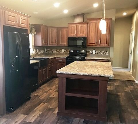 Beautiful new manufactured home on a great treed lot! This 3 bdrm 2 ba beauty offers a large functional kitchen with farm sink and over sized island with pendant lights. Elements laminate flooring in kitchen and dining area and carpet in the living room and bedrooms. Generous master suite offers 2 spacious closets, dual sinks and a large walk-in shower. The lot has many tall pines. This is a must see!