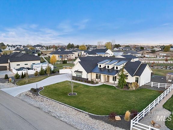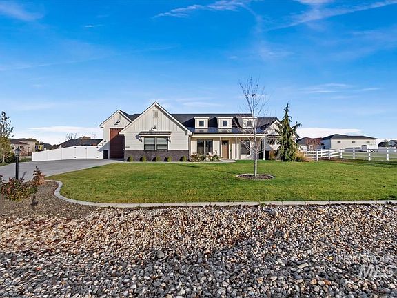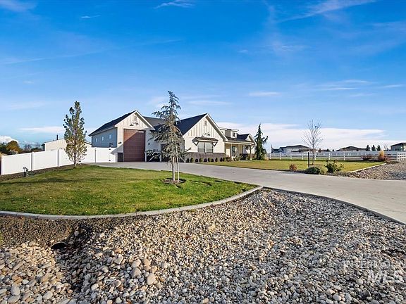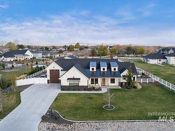 Step into the epitome of rural sophistication with this custom-built modern farmhouse, nestled in esteemed Purple Sage Estates. This property is a true lifestyle statement, boasting a magnificent 1893- sqft shop that serves as the ultimate flex space – a workshop, private retreat, or guest quarters, this space is equipped with a kitchen, bath, and HVAC. The home is a testament to quality craftsmanship that welcomes you to a open great room with a cozy gas fireplace and built-in cabinets. The single-story home has 8 ft doors and 10 ft ceilings, 4/5 bedrooms, 3 accessible baths and 45 ft. RV bay with 18 ft. ceilings ! An entertainer's kitchen includes built-in appliances, farmhouse sink, sprawling island with quartz counters and walk-in pantry. The master offers a fully accessible bathroom with roll-in shower, soaker tub, and walk-in closet. An outside oasis with wide walkways, RV side access, built-in barbecue,green house, raised garden beds, chicken coop, hot tub on 1 ac with east exposure. Middleton schools.