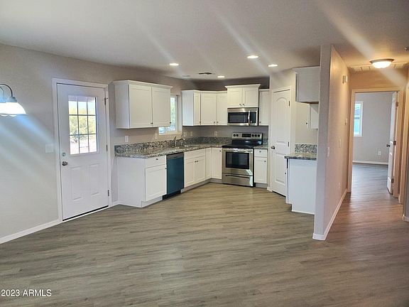 Recently completed spec home on a 4 acre lot. Home has wood look vinyl flooring throughout, kitchen has granite counter tops, stainless steel appliances, and a walk in pantry. Bathrooms have granite counter tops and tile surrounds. Lot has a nice variety of cacti and trees and with 4 acres lots of room for horses etc. Electric service is provided by San Carlos Irrigation Project. Please note taxes shown are for vacant land. There will be a total of 5 houses on the shared well and all owners will be required to pay $300.00 into the well operating account prior to using the well.