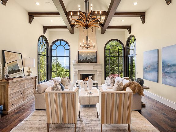 Gracious Mission Style retreat thoughtfully sited on 2.6 acres. Artfully renovated providing elegance, modern amenities and sweeping mountain views. Rich hardwood floors, elaborate wood details, and custom ironwork enhance the architectural appeal. Floor-to-ceiling arched windows, volume ceilings w/exposed beams, imported Italian tile, heated floors kitchen and primary bath, wine cellar, seamless indoor/outdoor spaces, pond + sports court. All new siding, four new furnaces & AC to be installed.