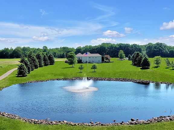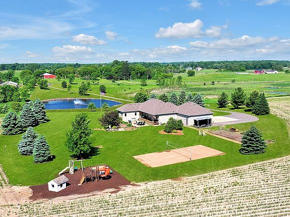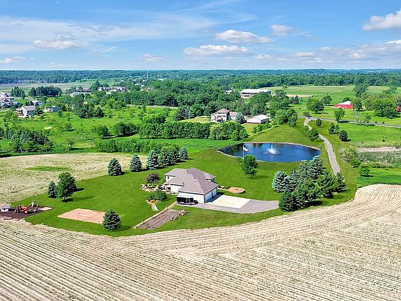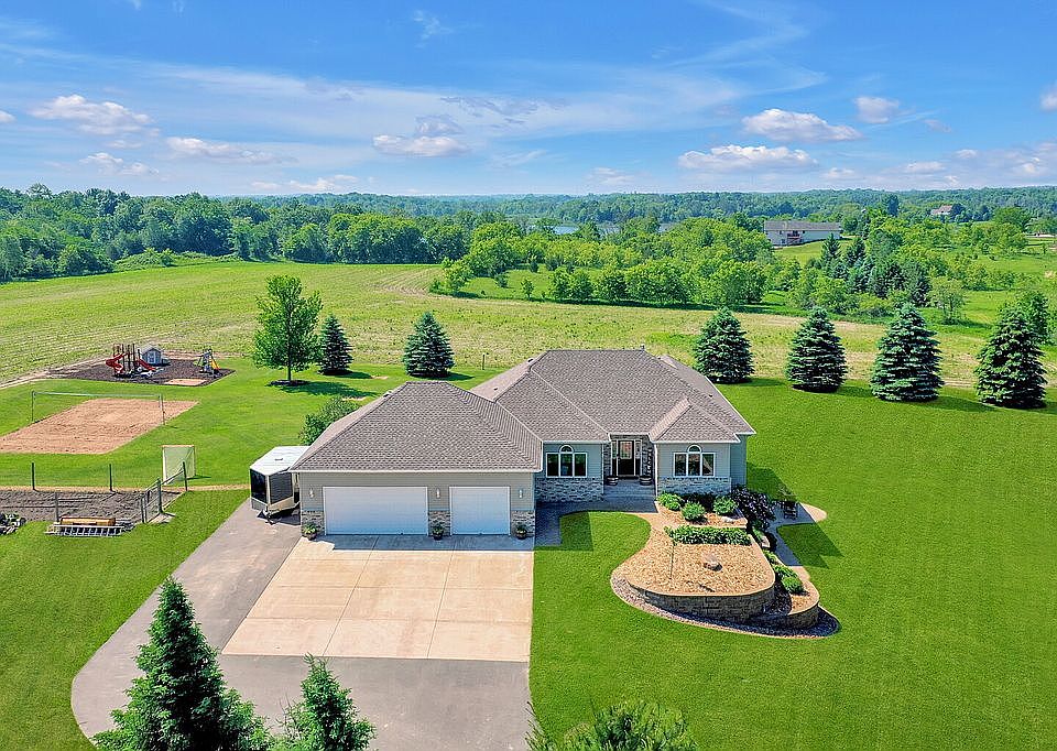 Stunning rambler on 7 acres located in a parklike setting with a playground, volleyball court and horseshoe pits!!! This home is minutes to the freeway yet far enough to enjoy privacy! The 850' driveway passes a gorgeous pond with fully automated fountain in the summer months it is also perfect for a hockey pond in the winter months. You will not be disappointed with the layout of this country classic, from the vaulted ceilings to the hardwood & slate floors, large eat-in kitchen walking out to a paver patio with built in firepit. There are three bedrooms located on the main floor, formal dining, huge great room and bar for entertaining big gatherings, In-floor heat installed throughout entire lower level and garage. The 16 zone irrigation system keeps the lawn and gardens looking fantastic!