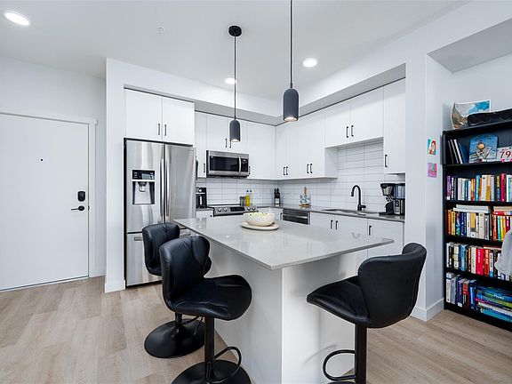 Modern and spacious 1-bed, 1-bath condo at Sky Gate. Built in 2022, this unit has been well-maintained and is in near-new condition. This third-floor unit on the outer north-west facing side of the complex has a large covered deck, 9' ceilings, an open floor plan, and a huge gallery window, providing plenty of sunlight. The kitchen features Samsung stainless steel appliances, soft-close cabinetry, and quartz countertops. Luxurious wide-plank flooring throughout, and a welcoming carpet in the bedroom. Bright 4-piece bathroom with a soaker tub. Includes an in-suite laundry room with a storage area, and a designated underground parking stall with adjacent storage space. Built green and energy efficient with triple-pane windows and a heat pump for heat and air conditioning. This pet, family and rental-friendly building is rich in amenities, including a rooftop deck, gym, dog run, community garden, recreation room, guest suites, EV charging stations, and visitor parking.
