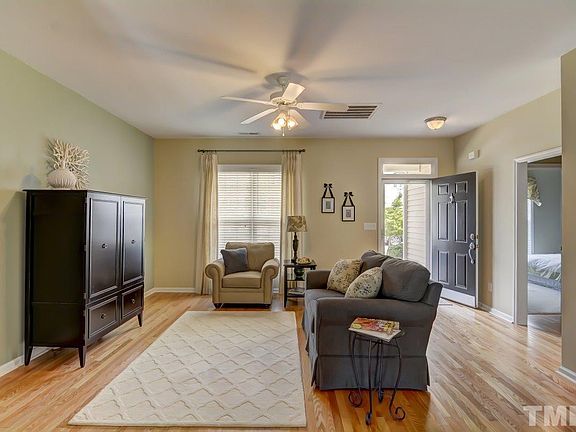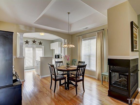 Fantastic move in ready split bedroom ranch in popular Hedingham. Open floor plan. 9 ft ceilings. Fresh paint. Beautiful hardwoods throughout most of home. Spacious family room. Formal dining features trey ceiling. 3 sided fireplace. Bright and open kitchen offers center island. Large master suite includes trey ceiling, garden tub/shower, dual vanity & walk in closet. New deck. Outside storage. Stone front porch. Swim & golf community with fitness center.