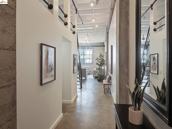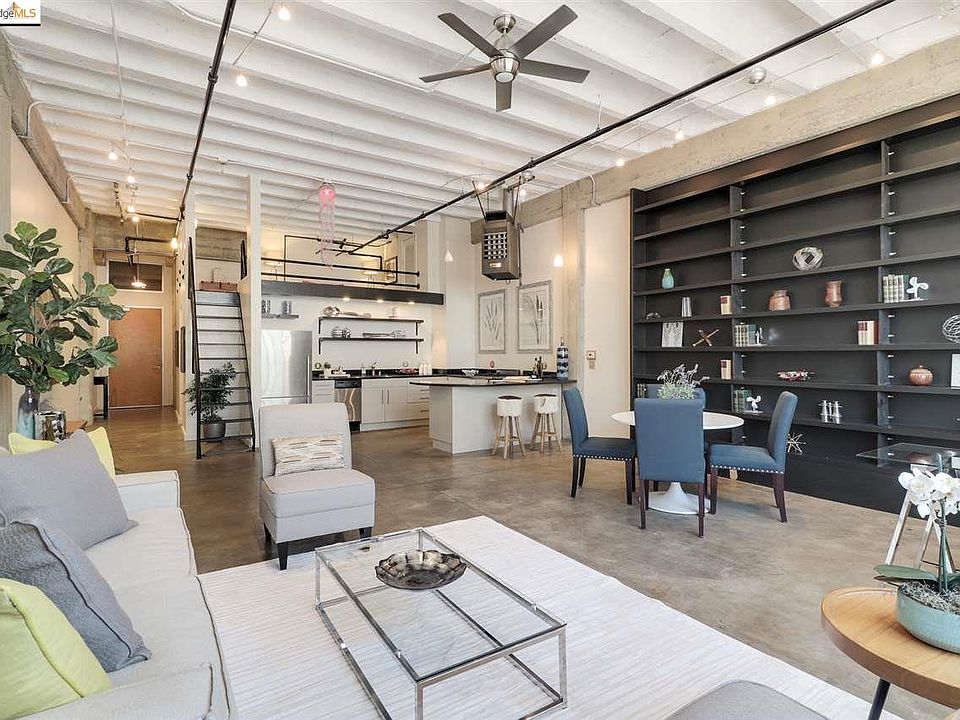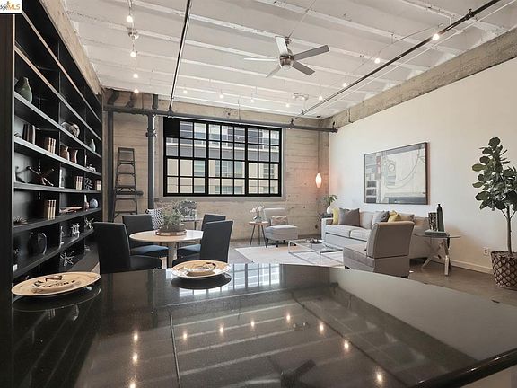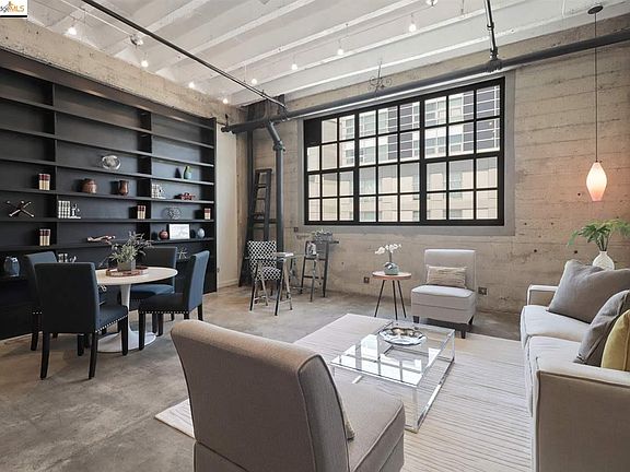 Top floor loft at Fourth Street Lofts, built in 1923 as Safeway Stores' warehouse. Newer kitchen, fabulous floor to ceiling bookcases with library ladder. Flexible living/dining/working space within 1118 square feet, new, well-insulated windows, in-unit laundry, parking for one vehicle in secure garage below. Elevator serves all four floors from garage. The 37 live/work units of Fourth Street Lofts were among the first Jack London district warehouse conversions in the early 1990s. Pet friendly. Exceptionally high-speed internet in building available by subscription. HOA $574 . On-site manager. Easy access to superb public transit including BART, ferry to San Francisco, AC Transit and free Broadway shuttle. Year-around farmers' market, shops, cafes, coffee bars and coffee roasters, wineries, pubs, entertainment and waterfront biking and walking paths. In the heart of Jack London's lively urban neighborhood, still home to a bustling weekday produce market.