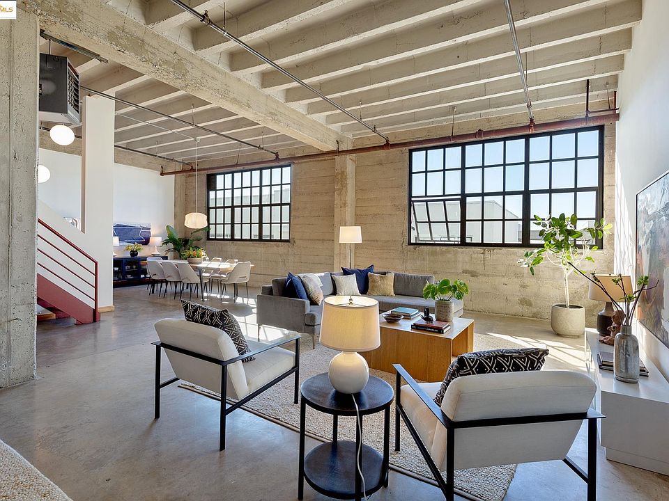 This live/work unit in the historic Safeway warehouse in Jack London Square features soaring ceilings, abundant natural light, and exposed concrete walls that frame large southern exposure windows. Converted to a 40-unit condo complex in the 1990s, this true loft space maintains the industrial finishes and unique character of the classic Oakland building. Massive concrete pillars and the beamed ceiling harken back to its factory days but the unit has modern amenities and updates throughout. The efficient, newly renovated kitchen has ample work and storage space and quality appliances. A large dining area is flooded with light. The full bath has an in-unit washer/dryer combo. The layout has over 1600 sq ft with a large bedroom loft and enclosed storage, and great walls for art! Underground secure parking for two cars is included. This is an amazing and flexible space in a well managed building in the heart of the Jack London Square. Enjoy restaurants, brew pubs and access to downtown Oakland, the Ferry & BART.