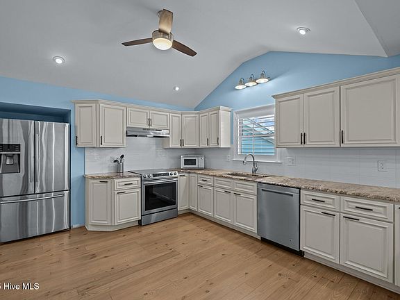 NEW PRICE! Welcome to 247 Bayview, your own personal waterfront paradise, where modern updates meets classic beach cottage feel. This fully furnished 4 bedroom 3 bathroom home was completely renovated in 2019 and includes updated kitchen, bathrooms and hardwood floors throughout. The heart of pine floors in the living room and kitchen were sourced from centuries old beams that once supported the old textile mills in Franklin County, NC. These textile mills were build in the late 19th to early 20th century and were torn down in the 1970s to 1980s due to the decline on the textile industry in North Carolina.