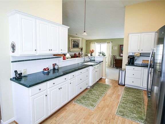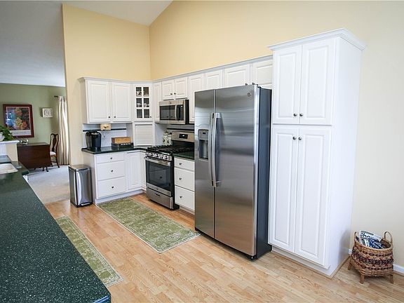 Adorable 2001 built ranch in Greece. You are welcomed in by a massive entryway. The entryway leads you into the large living room with vaulted ceilings, built in shelves and a gas fireplace. From the living room overlook the eat in kitchen. All your cooking will be a breeze with the wonderful white cabinets, new stainless appliances, tile back splash and a spacious dining area. Down the hall you will find 2 bedrooms and 2 full baths, including a primary suite with an enormous walk in closet. For extra living space you will find a sunroom perfect for enjoying sunny days. Outside the partially fenced backyard offers a patio with a retractable awning. Plus, lovingly maintained landscaping and a 2 car attached garage! Don’t miss the chance to make this one yours! Delayed negotiations until 11/16/23 at 10am.