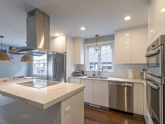 Desirable Newton line!! Oversized luxury Town Home Better than New Construction!! Be amazed as you walk into this huge 1904 square foot unit spread across 3 levels and feels more like an elegant single family home! A sun-filled 3 bedroom and 2 & 1/2 bathroom duplex featuring Eat in Custom Kitchen w/ Premium Miralis cabinetry, Quarts Counter Tops island Seating and Cooking, Top of the Line SS Appliances,Hard Woods & tile throughout, High Ceilings, Rich Moldings,Crowns,recessed Lighting; Upgraded Fixtures, walk-in closets in all 3 generous BR's; 2nd floor full side by side laundry; bay window, & extra wide stair wells & hall ways easy for furniture! There is a large parking area easy to maneuver with 2 deeded spots. Elegant French door with side lights leading to grilling deck with privacy partition. Short stroll to Everything Moody St, & convenient to 128, mass pike, the express bus & the W. Newton and Moody St train stops.