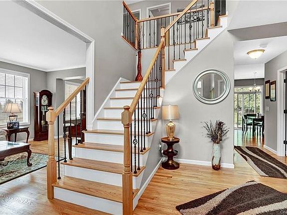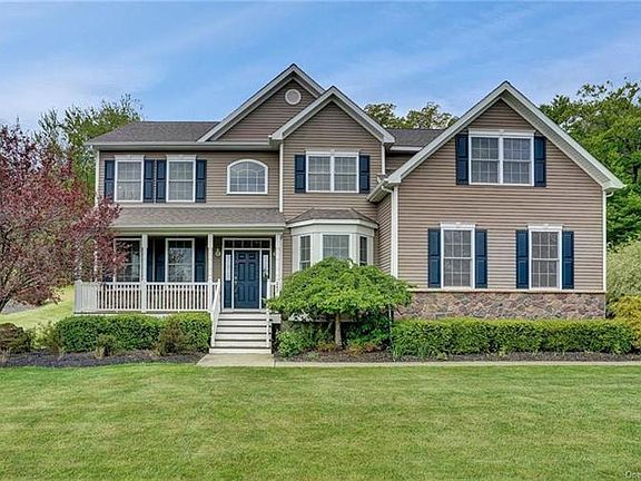 Views in all directions at this Elegant Home and Property in an exclusive Golf Club community. A Charming Porch invites you into a 2 Story Entry. On the Main Level is a formal LR that flows into the formal DR. Hdwd Floors and Recessed Lighting. The Kitchen is a cook's dream w double oven, center island, SS appliances, granite and Dining Nook. Family Rm w a beautiful marble inlay gas fireplace, great for entertaining. Last, a Library w Bay window and a Powder Rm. Upstairs, a spacious Mstr Bedroom w attached den, 2 WICs and a gorgeous Bath w Soaking Tub, Shower and separate sinks. 3 more bedrooms and a main bath complete upstairs. Finished basement w a Bar Kitchenette, quartz counters, Entertainment Room w Surround Sound, a Murphy Bed w built-in shelving and a Full Bath. Outside is a Stunning Stone Patio with a Firepit and so much space! Further up the property, a park-like paradise w panoramic mountain views. 6 zone Sprinkler System. A Beautiful Home and incredible Commuter Location!