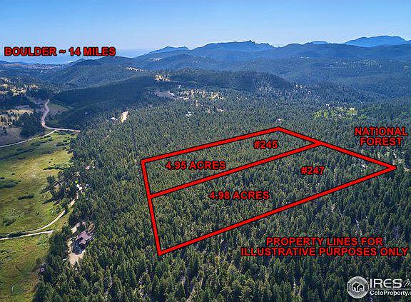 Snow-capped Continental Divide views from this PRIVATE 10 acres adjacent to USFS land! Potential views surround this FLAT & sloping topography with a healthy diverse forest & many rock outcroppings. This parcel consists of 2 separately deeded 4.9+ ac parcels: 245 & 247 Gordon Creek (R0024320 & R0024319). Build a 2nd house or keep all 10 acres. Convenient location only 3 miles to Nederland & 14 miles to Boulder. Transferable Forest Service easement with a rough driveway in. All corners are flagged. Access is from Sugarloaf Rd. Well/Septic needed.