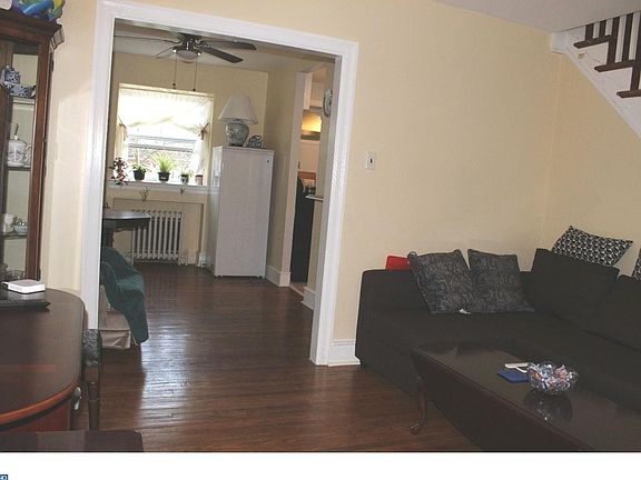 Don't miss out on this stone townhouse, with an open front porch, beautiful hardwood floors and bright sunny rooms! This 2 bedroom gem offers lots of space, has a lovely rear fenced yard, and is in move in condition. The first floor has a full size living room and dining room, with a breakfast bar opening to the kitchen. The kitchen was redone and has a built in dishwasher, garbage disposal, and gas stove, and has been expanded to include a pantry area and exit door to the yard. The 2nd floor has a master bedroom, additional full size bedroom and a gorgeous totally renovated ceramic tile bathroom. The full basement has laundry facilities. There are replacement windows, new light fixtures and fans, and numerous other updates. This home is conveniently located, within walking distance to shopping, schools and transportation.