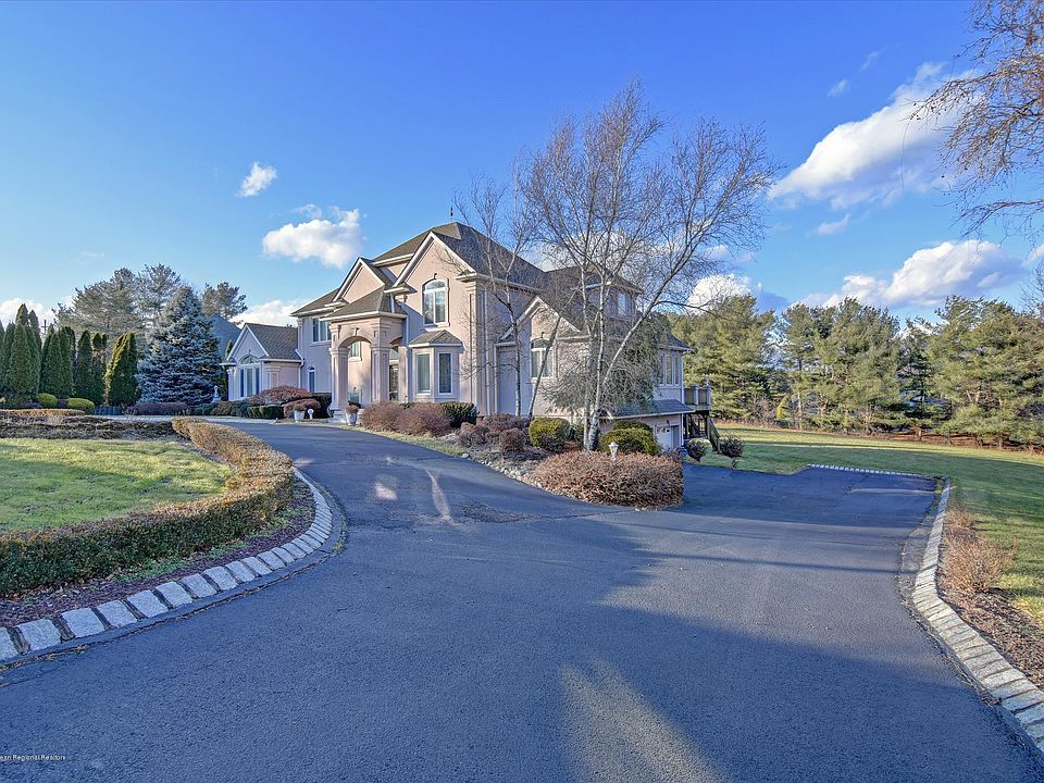 Richly designed home awaits you! Located on 1+ acres of expansive property a Circular drive leads you to double entry doors and fabulous bright open light expansive floor plan! additional 1400 sq.ft of living space in walk-out basement3 custom fireplaces ,private master suite master bath has his/her vanities, all jacuzzi tubs in all bathrooms, double shower, vaulted ceilings, kitchen is a chef's delight w/ GE Monogram appliances, center island, granite ctp.,great room offers soaring ceilings, walls of glass w/panoramic views of your substantial property, marvelous finished lower level is perfect for large parties or intimate gatherings,. media room has custom, gorgeous fplc. game room wet-bar, wine closet, family room and full bath!! Close to GSP Bell Works, Holmdel Park, shopping and sch