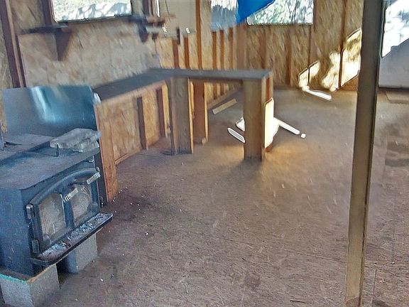 Rustic cabin, cast iron wood stove for heat, roomy feeling with tall ceilings 8 to 12 feet with open beams, metal roof, enclosed bathroom with toilet, metal bathtub, nestled on 3.9 acres at the end of the road, approximately one mile in elevation, three greenhouse sites with raised beds, upper house still has plastic sheeting, and extras.