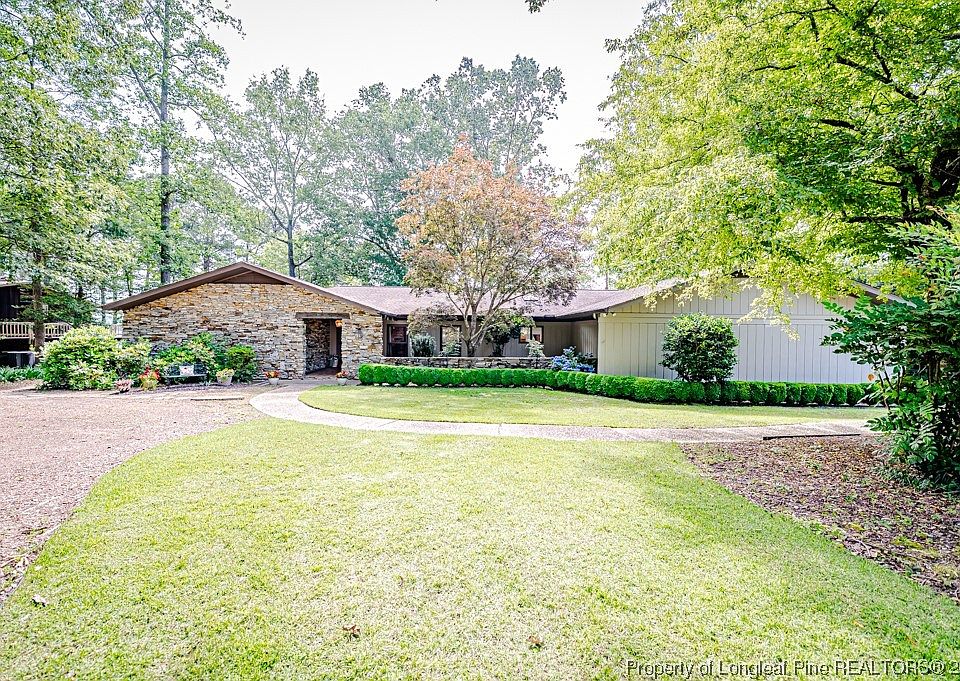 Rare 1 story lakefront ranch! Huge formal living room with beamed vaulted ceiling, tons of bookcases, hardwood floors, gas fireplace, multiple rooms open up to the lake. Lot is level with dock for an easy walk out to the water to enjoy the lake life! Formal dining room with crown molding and hardwood floors - Gourmet kitchen with center island, sky light, butlers pantry, separate ice maker and wine cooler, 5 burner gas range, DOUBLE ovens, warming drawer, Bosch dishwasher, and built-in SUB-ZERO refrigerator. Appliances for all your cooking needs! Master bedroom, master bath, living room, family room and Carolina room all have open views of the lake!