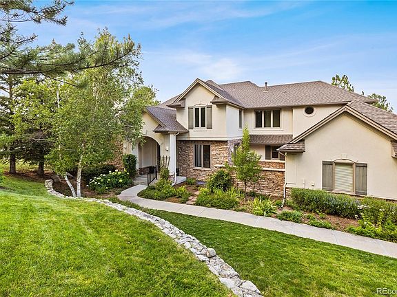 As far as warm welcomes go, it’s difficult to beat the treed and beautifully landscaped walkway to the front porch of this fabulous Castle Pines Village executive home. This distinctive space, nestled among pine trees, boasts an entry that’ll have you feeling at home in no time. Inside, you’ll find a stretch of thoughtfully laid-out living space, charming french doors, lovely windows, two fireplaces, built-in shelving, and pride of ownership throughout. We are certain you will find that the good vibes are also built-in. Upon entry you will be greeted by both a lovely dining room and living room boasting a cozy fireplace. Hardwood floors extend the entire main level and lead to the heart of this fine home, the kitchen/family room combo. The spacious kitchen features updated appliances, granite countertops, a large center island, walk-in pantry, 42 inch cabinets, and conveniently overlooks the comfortable family room. A gorgeous stone fireplace anchors the family room and French doors lead to one of the many outdoor entertaining areas. Hardwood floors also extend up the staircase to the private office, perfect for the "remote worker". The second level is where you will find three bedrooms, two full bathrooms in addition to the private primary suite. The primary offers gorgeous views, a 5-piece bathroom, and large walk-in closet. The professionally finished walkout basement offers the extra space most people are seeking with a large rec room, guest suite with 3/4 bath + a gym or secondary office space. This home is located on a private culdesac with many trees and mature vegetation. If peace and quiet is what you are seeking, you are home!