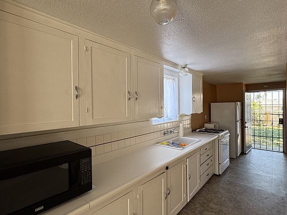 Welcome home to this charming and well-maintained 2-bedroom, 1-bath home featuring a spacious galley-style kitchen with plenty of cabinet storage, a gas stove, refrigerator, and microwave included. The home boasts warm, inviting tones throughout, carpeted bedrooms, and ceiling fans for added comfort. Enjoy natural light through large windows with sheer curtains and step outside through the secure back door to your private yard and detached 2 car garage. Apply Now!