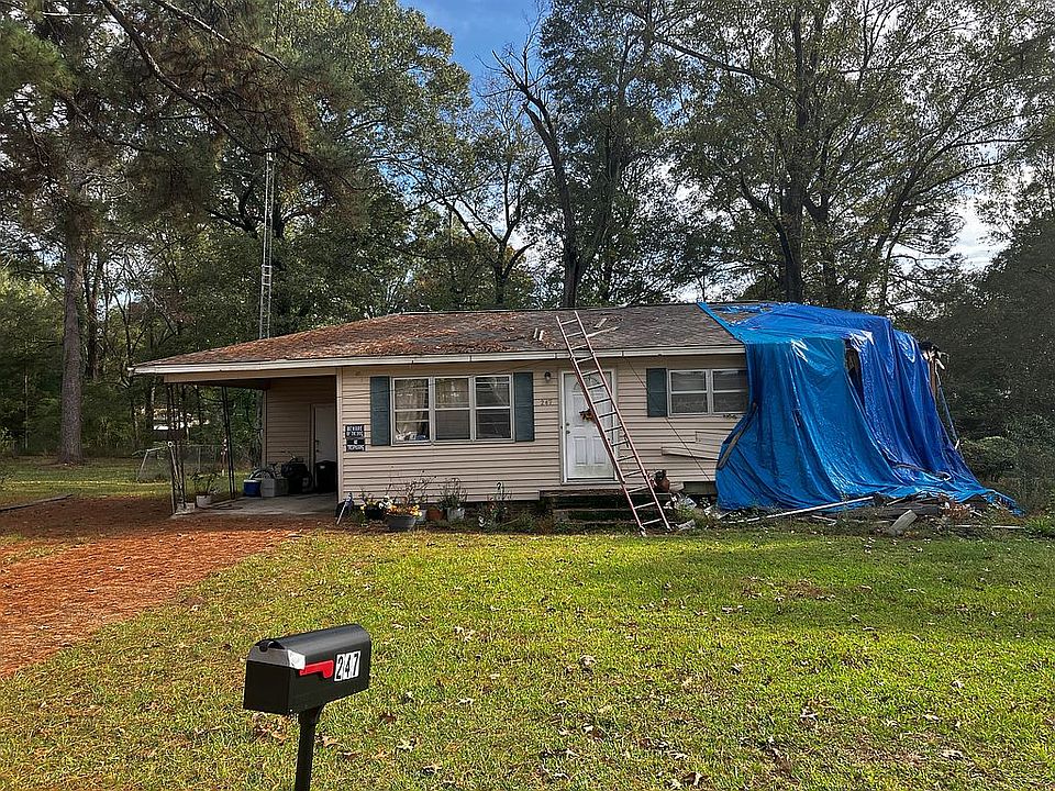 The house has been displaced from its foundation due to a fallen tree. No HVAC and needs new roof.