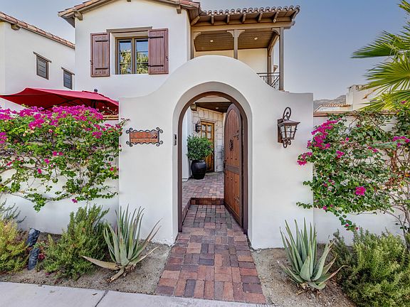 The desert's leisurely lifestyle meets Historic Tennis Club. Beautifully appointed 2 bedroom plus den and media room. Built-ins, wall-to-ceiling stonework, and overall design choices including vaulted ceilings begin to tell the story. BBQ space with its custom wrought iron design is a jaw-dropper. The ''Batchelder tile'' inspired fountain is exceptional. Living room is framed by a series of 10-foot French doors opening to wrap around patios. Kitchen upgrades include custom granite countertops, high end appliances, and designer cabinetry. This home's designer took great liberty in creating a space that is ANYTHING but cookie cutter. Breakfast area opens to patio in grand fashion. Formal dining is yet another option. Home office is currently used as a guest room. Upstairs TV room / den includes wet bar with stone backsplash. Master suite enjoys a patio looking out over the town. Double sinks, stunning finishes, and oversized master closet is located within the master bath. Laundry is located upstairs. St Baristo's pool area is world class. Think Italian Riviera meets Slim Aarons' photo shoot! Proximity to walkable historic neighborhoods hugging the San Jacinto Mountains in Old Palm Springs is another plus. Restaurants and shopping are a couple blocks away. So much to love. You'll find it here!