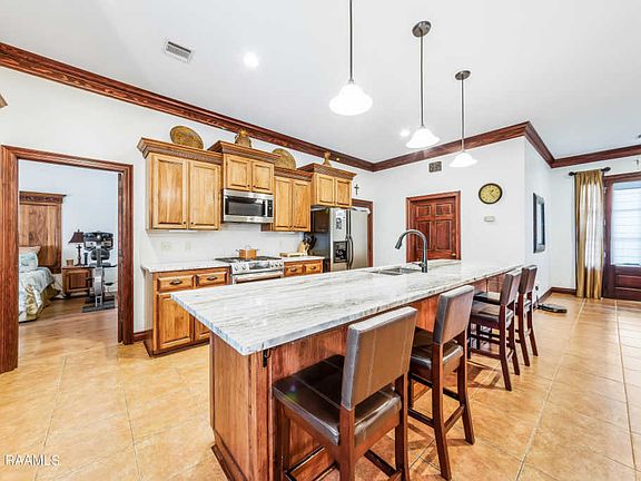 Update home sitting on 4 lots corner to corner in town easy access to grocery stores, churches and area festivals. Home was recently updated including kitchen cabinets, granite, window treatments, master bath and jacuzzi tub. Built with family time in mind, includes a split floor plan, wide open living area great for family gatherings. Large island and plenty of kitchen cabinets. Bookshelves in living room and master are staying. 3 bedrooms downstairs with 2 full baths. Upstairs is a full bedroom and bathroom that is accessed from a separate entrance. Backyard and patio are set up for relaxing and enjoyment. Outdoor kitchen is large and fully functional with a full kitchen and bath. Step out of the privacy yard to a large shop with roll up door and a separate driveway accessing main road